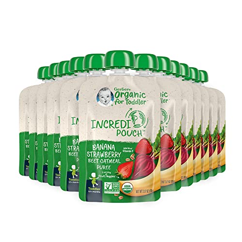 9 favorite fruit and veggie pouches: 3 Banana Blueberry, 3 Apple Pear Peach and 3 Apple Sweet Potato with Cinnamon. Made with non-GMO ingredients, this Gerber puree contains no artificial colors, flavors or sweeteners and no added starch. Toddler food pouches with clear windows fit perfectly into tiny hands to encourage your little one to improve feeding skills. The Smart Flow spout on the baby food pouch gives your toddler better control with fewer messes. The pouches are easy to toss into a diaper bag for snacking on the go.