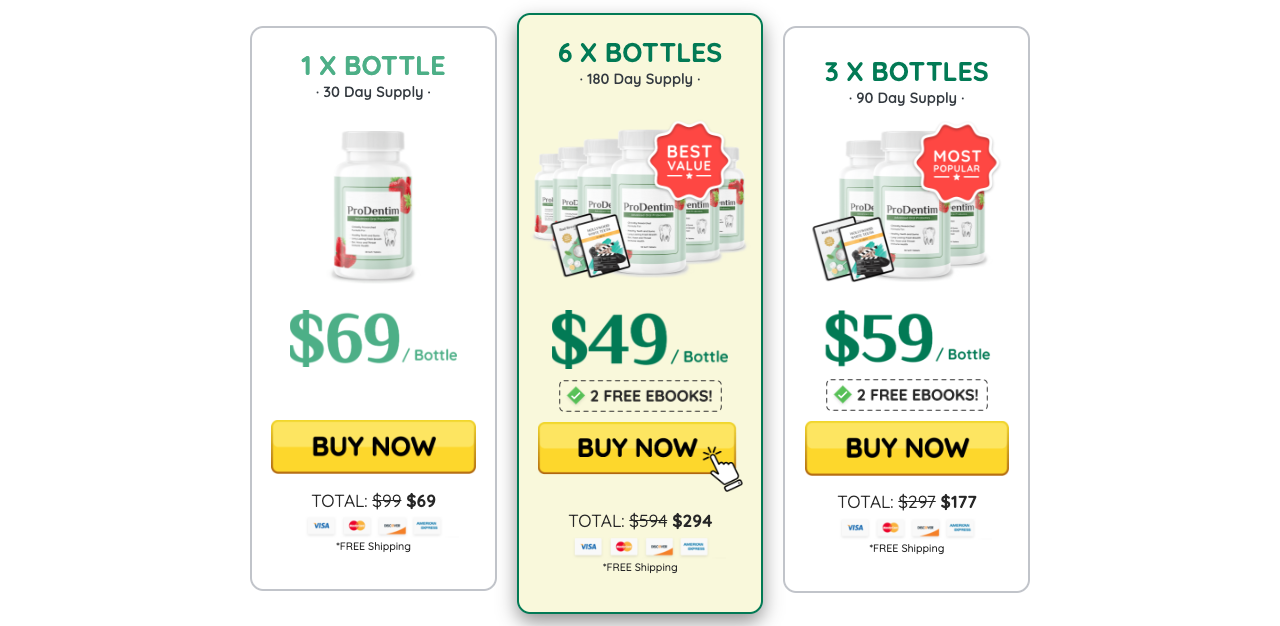 - Buy a 180-day supply at $49 per bottle: 6 ProDentim bottles + 2 free e-books + free US shipping