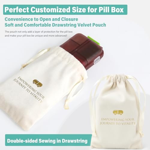 ★A Drawstring Velvet Pouch for You – We are pleased to present you a soft and comfortable drawstring velvet pouch, the compact size is just right to hold the pill box. The pouch is exquisite craftsmanship, high-end elegant, printed with exquisite logo and text “EMPOWERING YOUR JOURNEY TO VITALITY”. The double-sided sewing in drawstring make it convenience to open and closure. The pouch not only add a layer of protection for the pill box, and make your pill box be unique and more advanced!