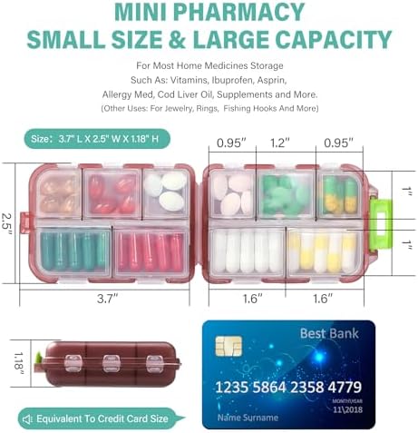 ★Mini Compact but Large Capacity – The small size makes it very convenient to carry, whether in your wallet, pocket, bag, drawer, car storage box, or other places. Each pill box has 10 compartments, 4 large and 6 small, to accommodate different sizes and quantities of medicines. Be suitable for most common medicines such as Vitamin, Cod Liver Oil, Supplements and other Medication (some large medicines may not fit).