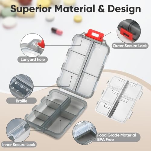 Safe Design – The medicine box adopts a double safety buckle design, with an external safety buckle and each compartment inner secure buckle. They are easy to open and close, and the inner lids can be removed as a whole for filling pills or cleaning.