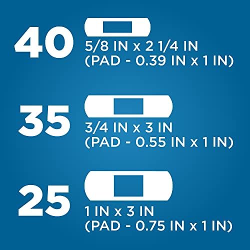 ASSORTED SIZES: Each package contains 40 pieces of 0.625×2.25 inch, 35 pieces of 0.75×3 inch, and 25 pieces of 1×3 inch bandages