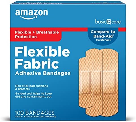 Amazon Basic Care Flexible Fabric adhesive bandages. Ideal for minor cuts, scrapes and burns.