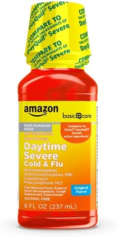 MAXIMUM STRENGTH: Amazon Basic Care Severe Daytime Cold and Flu Relief provides maximum strength relief of headache, fever, sore throat, minor aches and pains, nasal and sinus congestion, sinus pressure, cough and chest congestion
