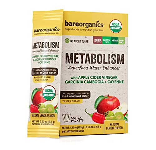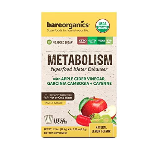 An organic water enhancer, our On-The-Go Metabolism Superfood Drink Mix delivers prebiotic fiber to support digestive health and appetite control. A specialized superfood water enhancer, this metabolism aid drink mix delivers metabolism-boosting ingredients like apple cider vinegar, Garcinia Cambogia, and cayenne to create the perfect companion on your journey to a healthier you. It dissolves instantly into hot or cold water which makes a deliciously refreshing lemon flavored water which you can enjoy at home or on-the-go. BareOrganics Water Enhancers utilize minimally processed ingredients to maintain potency and freshness without added sugar or artificial flavors or preservatives and are proudly USDA organic, non-GMO, kosher, keto-friendly and gluten-free. Size and other details: Conveniently packaged in 5 perfectly portioned, flexible packets. NOTE: This product is not intended to diagnose, treat, cure, or prevent any disease.