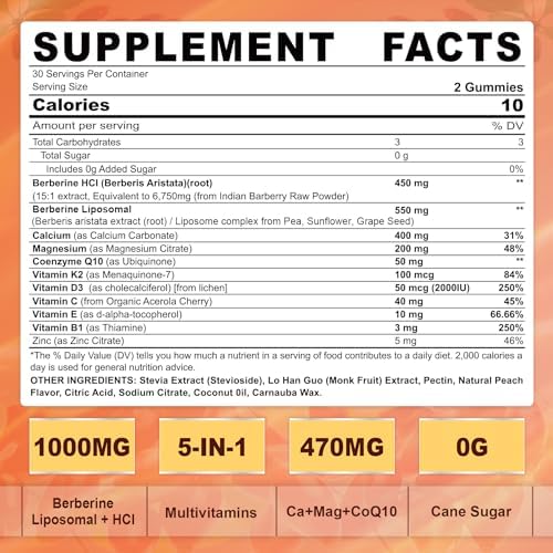 😍Enhanced Absorption with Liposomes: Our Berberine Supplement Gummies feature liposome technology specifically designed for optimal nutrient absorption, helping to protect the active ingredients during digestion ensuring maximum bioavailability for better results. Unique blend combining Berberine HCI, CoQ10, Magnesium Contains calcium, essential vitamins D3, K2, B1, C and E in one convenient gummy, providing a holistic approach to supporting overall health. No added sugar, healthier!