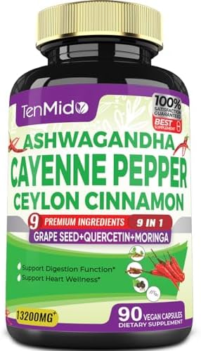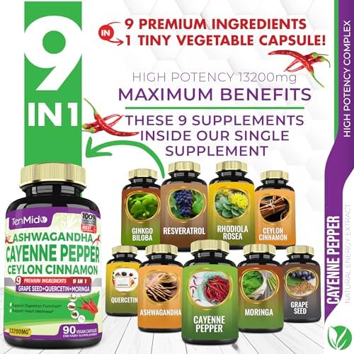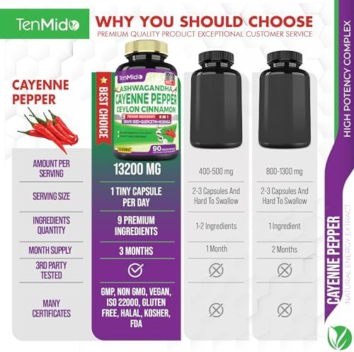 ❤️ High Potency Complex: Tenmido Cayenne Extract Capsules combination equivalent to 14800mg of the highest quality Cayenne powder with 8 extra powerful herbal problematic ingredients: Ashwagandha, Ceylon Cinnamon, Grape Seed, Quercetin, Moringa, Ginkgo Biloba, Resveratrol and Rhodiola Rosea. With the special optimized formula, our product has been shown to be one of the most advantageous herbs, highest absorption and bioavailability for your overall health.