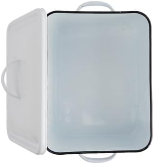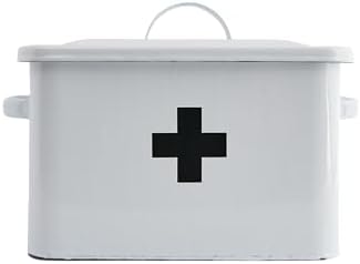 This classically designed storage box features sturdy metal construction with a playful enamel finish and lid with handle