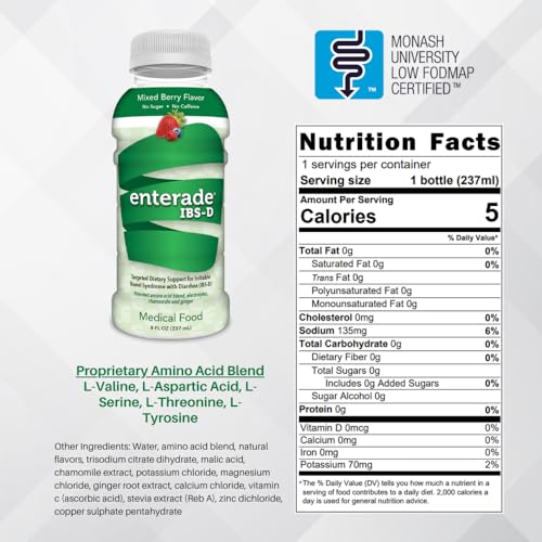 Over 10 years to Develop, Working with Gastroenterologists and Dietitians. enterade IBS-D is based on the discovery that precise combinations of amino acids at specific levels can deliver targeted GI benefits. The formula contains a patented blend of amino acids, plus electrolytes and minerals.
