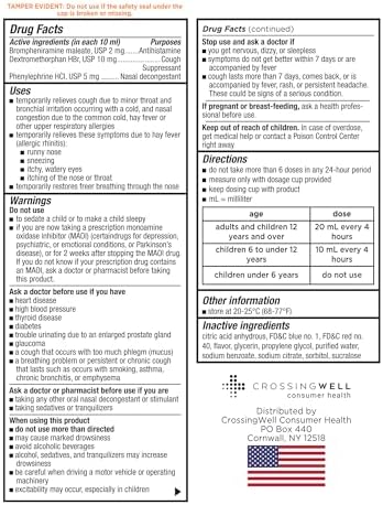 This cold medicine for kids includes the following active ingredients: Brompheniramine maleate – an antihistamine, Phenylephrine HCl – a nasal decongestant, Dextromethorphan HBr – a cough suppressent.