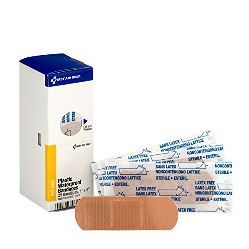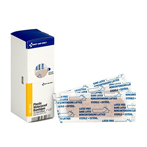 SmartCompliance Refill with 25, 1″ x 3″ plastic waterproof bandages per box. The plastic adhesive bandages are ideal for minor cuts, abrasions and puncture wounds. Made with a pliable plastic, each bandage is ventilated to aid in the natural healing process. They effectively protect scrapes and cuts while the non-stick pad absorbs drainage. The breathable backing repels water and dirt.
