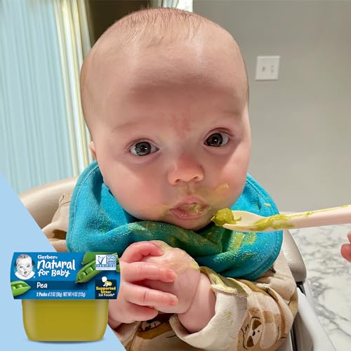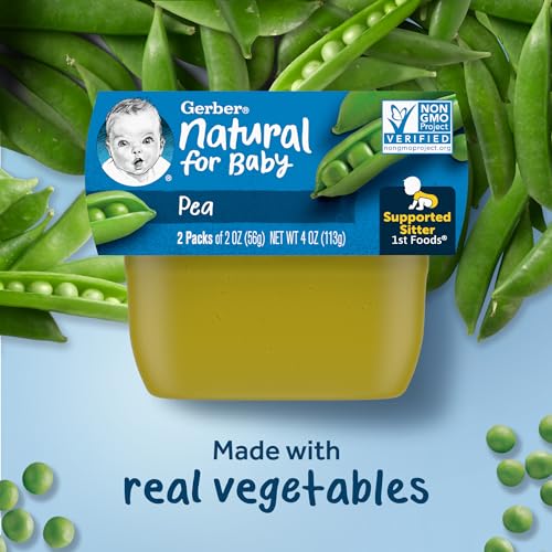 Start your baby’s lifelong love of vegetables with Gerber 1st Foods Pea Baby Food. This non-GMO baby food stage 1 recipe includes 100 peas in each tub, and this pea puree is unsweetened and unsalted with no artificial colors or flavors and no added starch. Gerber food stage 1 has the perfect texture for introducing solids to supported sitters, and this single-variety vegetable puree is ideal for trying new tastes and checking for sensitivities. Tuck these convenient BPA-free Gerber puree tubs into your diaper bag so you can easily feed your supported sitter on the go. You can feed your little one straight from the container, or add some to a bowl and refrigerate the leftovers for up to two days.
