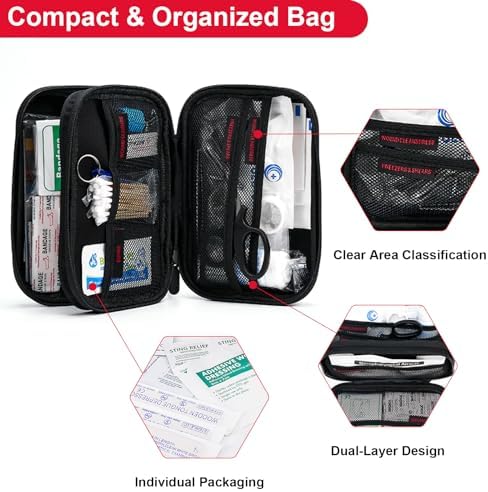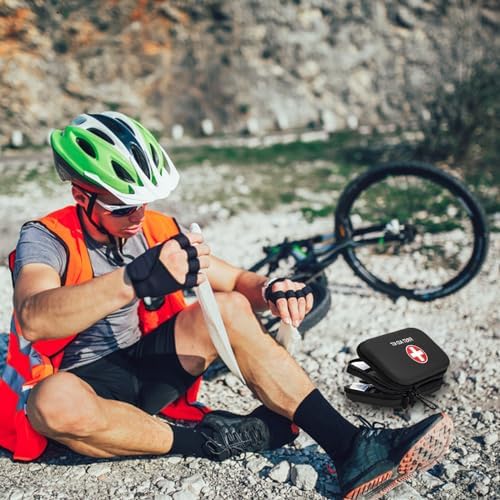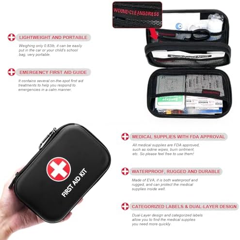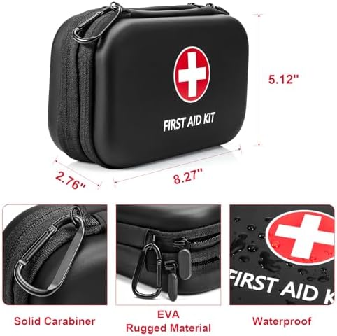 PORTABLE, COMPACT & WATERPROOF ♦ 8.3”×5.2”×2.8” compact size, 0.83lbs lightweight, Made of high quality EVA material, hard and waterproof, it can effectively protect the accessories inside the first aid kit and improve the durability. Compact size and carabiner greatly increase portability. Suitable for putting in car, bike, boat, school bag, etc.