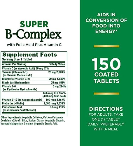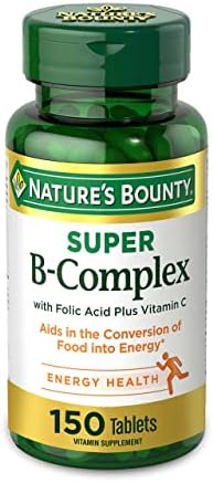 FOR ENERGY: 150-count Coated Tablets; Nature’s Bounty Super B-Complex with Folic Acid Plus Vitamin C plays an important role in energy metabolism in the body(1); Helps the body convert food into the fuel which is used to maintain energy(1)