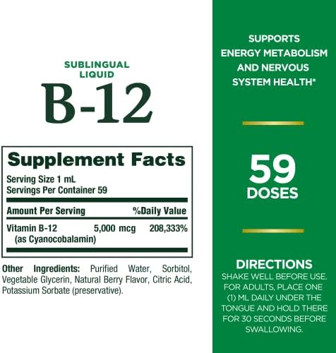 EASY-TO-TAKE LIQUID Nature’s Bounty Vitamin B-12 Sublingual Liquid makes it easy to get your daily dose of this essential nutrient; Simply place 1 mL daily under the tongue and hold there for 30 seconds before swallowing; You’ll love the delicious, natural berry flavor