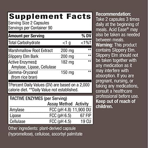 Taken with or between meals as needed, Acid-Ease combines Active Enzymes with gamma oryzanol (found in rice bran), slippery elm bark, and marshmallow root extract for digestive support.*