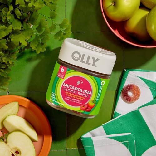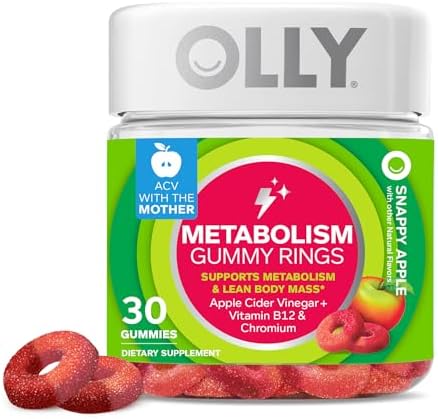 OLLY Metabolism Gummy Rings are packed with goodness to improve carbohydrate and lipid metabolism, promote steady energy, digestive health and rev energy production.* They’re expertly blended with Chromium, a clinically-studied dose that supports lean body mass and helps boost metabolism, Apple Cider Vinegar with the “mother” (strands of protein containing gut-friendly probiotics) and Vitamin B12, the fuel your body needs to burn without burnout.* The gummy rings come in a super delicious Snappy Apple flavor, so you can get the benefits of Apple Cider Vinegar without having to drink it. Zero synthetic flavors or colors, and they’re gluten-free. Adults, take 1 gummy per day. Chew thoroughly before swallowing.* At OLLY, good health is at the center of everything we do. We create delightful vitamins and supplements with real-deal benefits that help you live Happy Inside Out. *These statements have not been evaluated by the Food and Drug Administration. This product is not intended to diagnose, treat, cure or prevent any disease.