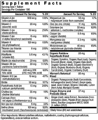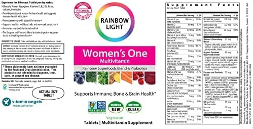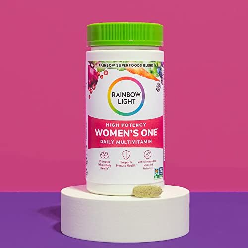 Rainbow Light Women’s One High-Potency Daily Multivitamin supports optimal nutrition and replenishment to elevate your daily wellness routine. This womens multivitamin also promotes whole-body health and supports your immune health to cover all your wellness needs (1). Made specifically for women, these womens multivitamins nourish your body and help fill nutritional gaps in your diet so you can thrive (1). Formulated with 100% or more of the daily value of 19 vitamins and essential minerals (1), this women’s multivitamin offers clinically proven absorption of key ingredients, ashwagandha, lutein, probiotics and more Vitamin C and Biotin than the previous Rainbow Light Women’s Multivitamin, to contribute to normal energy-yielding metabolism and healthy brain function (1,2). Thiamin also upholds normal heart function (1). Rainbow Light Women’s One High-Potency Daily Multivitamin is vegetarian, gluten-free, Non-GMO Project Verified, Certified C.L.E.A.N and Certified R.A.W. (1) These statements have not been evaluated by the Food and Drug Administration. This product is not intended to diagnose, treat, cure, or prevent any disease. (2) When compared to our previous Women’s One Multivitamin.