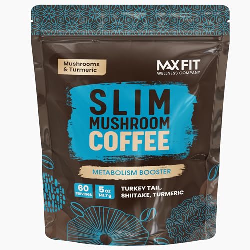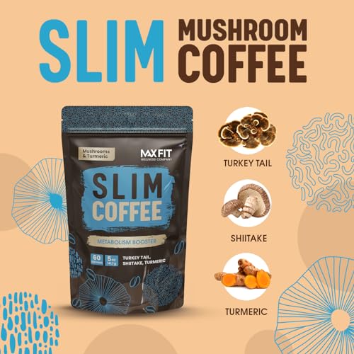 Slim Mushroom Coffee Organic (60 Servings) Mental Focus Plus Metabolism Boosting and Appetite Suppression for Diet Support – Turkey Tail, Shiitake & Turmeric, Mixed with 100% Arabica Instant Coffee