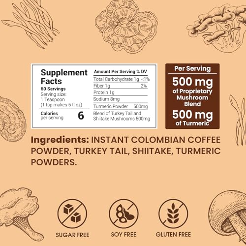 ENERGIZE YOUR FOCUS AND IMPROVE your diet results with one of the most effective mushrooms and turmeric blends in a delicious coffee, boosting productivity and contributing to overall health. Rise and shine with 500mg of the mushroom blend in each cup, packed with antioxidants, along with 500mg of turmeric, and only 50mg of caffeine. Enjoy a delicious medium roast with a well-rounded flavor profile.