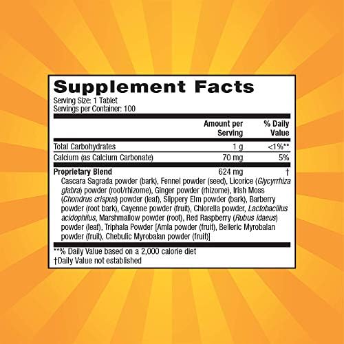 14 Herb Proprietary Blend – 624 mg Cascara Sagrada powder, Fennel powder, Licorice (Glycyrrhiza glabra) powder, Ginger powder (rhizome), Irish Moss (Chondrus crispus) powder (leaf), Slippery Elm powder (bark), Barberry powder (root bark), Cayenne powder (fruit), Chlorella powder, Lactobacillus acidophilus, Marshmallow powder (root), Red Raspberry (Rubus idaeus) powder (leaf), Triphala Powder, Amla powder (fruit), Belleric Myrobalan powder (fruit), Chebulic Myrobalan powder