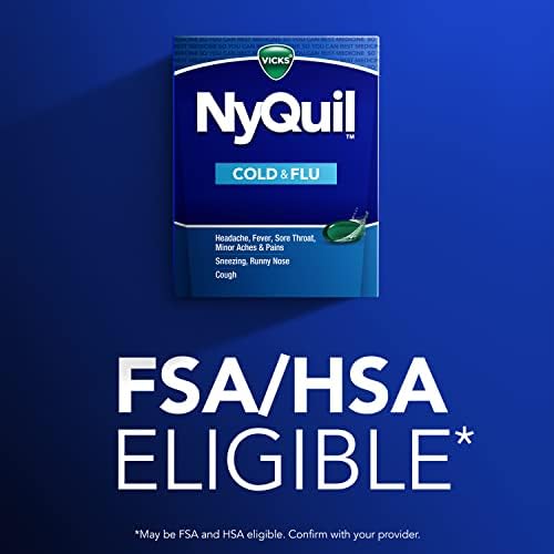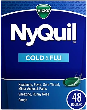 From the world’s #1 selling OTC cough and cold brand†, Vicks NyQuil Cold & Flu Liquicaps provides fast, powerful relief for your worst cold and flu symptoms. When cold symptoms keep you up, turn to Vicks NyQuil Cold & Flu nighttime relief medicine to help you get the rest you need. When you need fast relief, this powerful, multi-symptom relief medicine treats headache, fever, sore throat, minor aches and pains, sneezing, runny nose, and cough due to minor throat and bronchial irritation. Nothing works faster. Vicks has been trusted for over 125 years to relieve your cold and flu symptoms. Vicks NyQuil is the #1 pharmacist recommended nighttime cough, cold & flu brand* Active ingredients per dose (2 Liquicaps) for adults are acetaminophen 650 mg (pain reliever/fever reducer), dextromethorphan HBr 30 mg (cough suppressant), and doxylamine succinate 12.5 mg (antihistamine). Store at room temperature; do not refrigerate. Take only as directed. Do not exceed 4 doses per 24 hours. Adults and children 12 years and over take 2 Liquicaps every 6 hours. *2022 Pharmacy Times Survey of Pharmacists OTC Recommendations † Nicholas Hall’s global CHC sales database, DB20