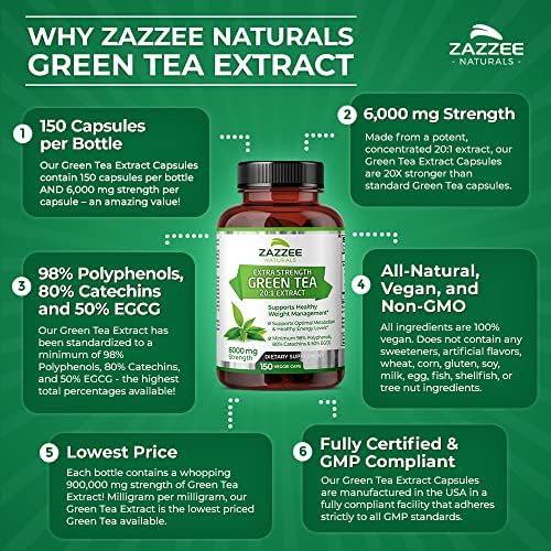6000 MG STRENGTH: Each capsule contains 6000 mg strength of Green Tea Extract from a potent, powerful 20:1 extract. Combine that with a minimum of 50% EGCG, 80% Catechins and 98% Polyphenols, and our Extra Strength Green Tea Extract is one of the strongest dosages available!